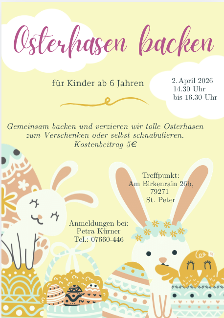 Am Gründonnerstag, den 02.04.26 backen wir ab 14.30 Uhr wieder mit den Kindern des Dorfes und Ferienkindern Osterhasen und mehr aus Hefeteig.