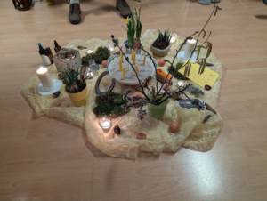 Die Imbolc – Mitte mit den Farben weiß, gelb und unterschiedlichen Erdtönen.